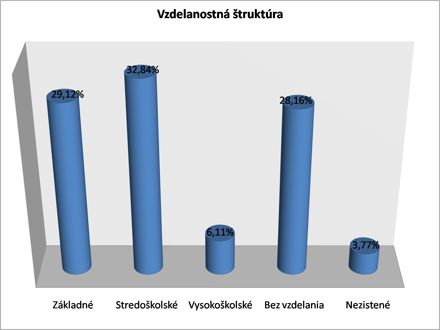 Bez vzdelania je 24 %, čo je viac ako v rámci Slovenska, kde táto skupina tvorila v roku 2001 len 20 %. O čosi nižší je podiel obyvateľov s vysokoškolským vzdelaním 6,11% pričom v rámci Slovenska je to(9 %).
